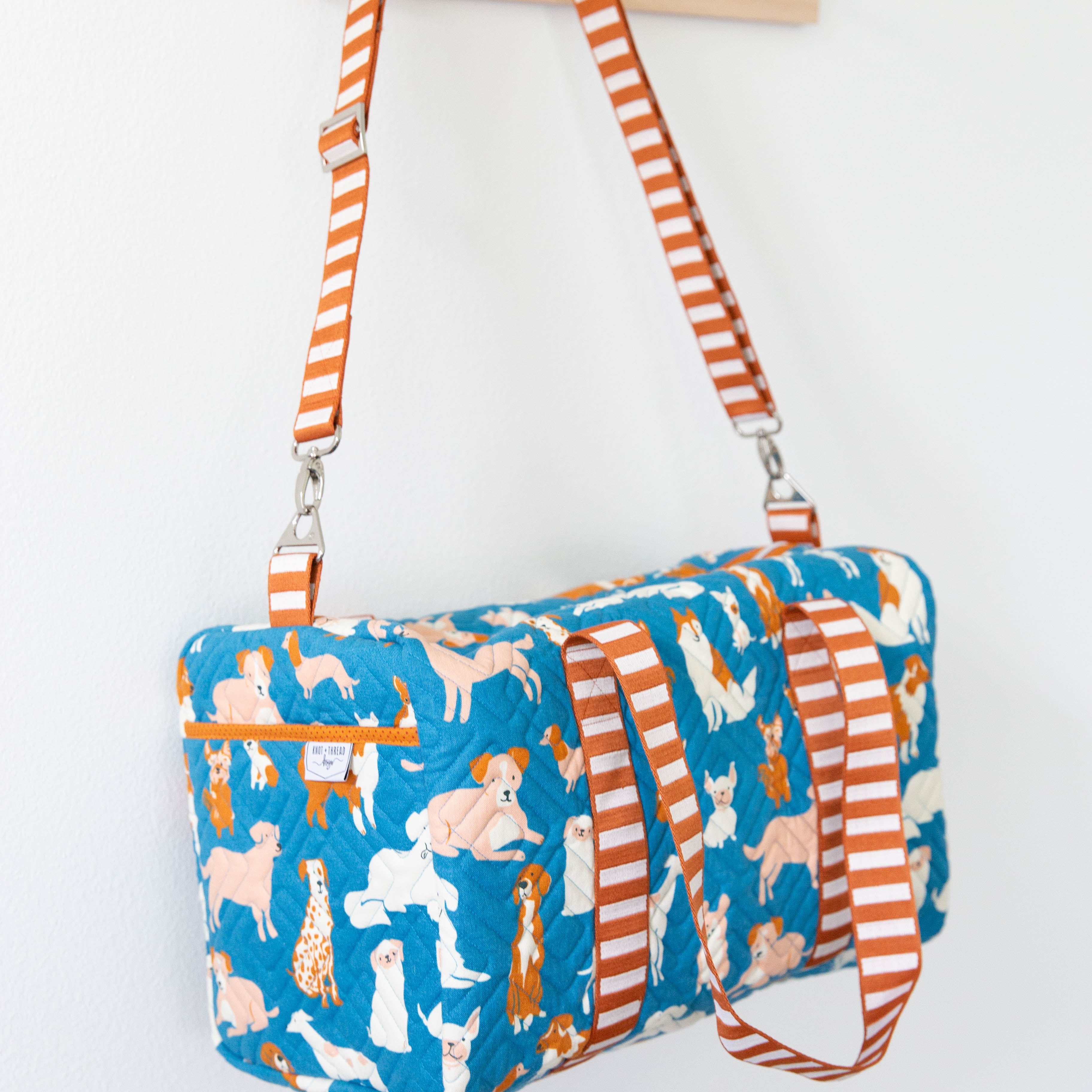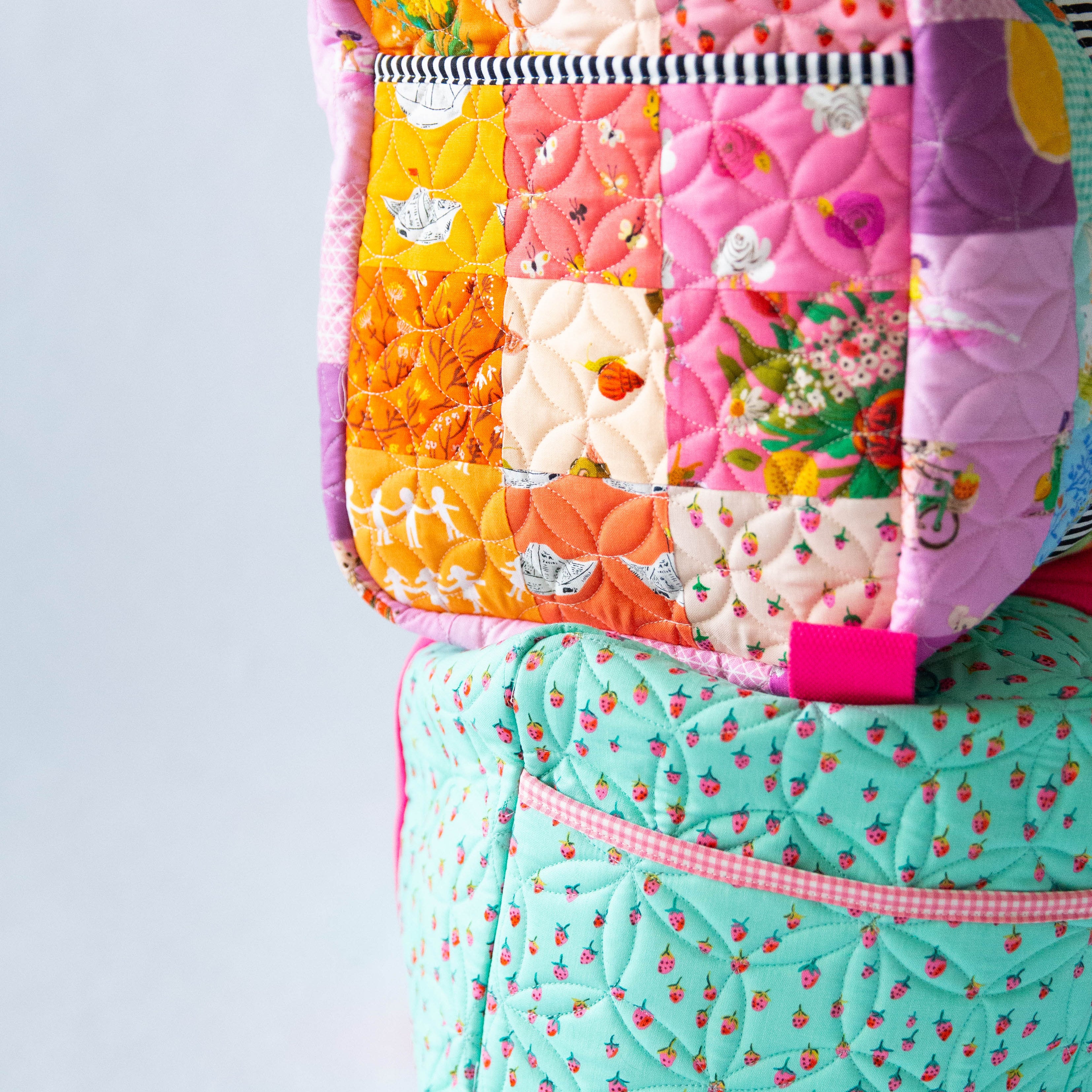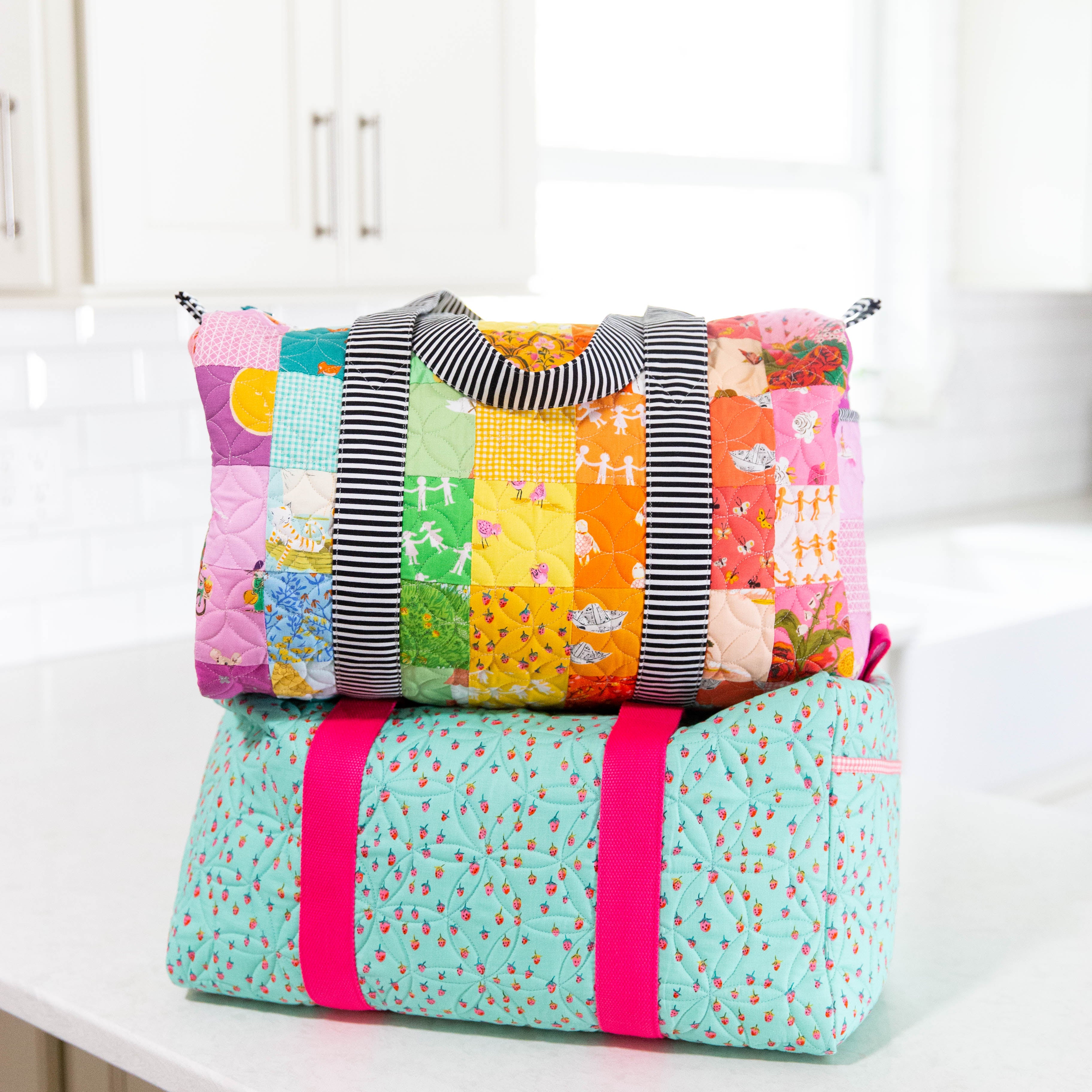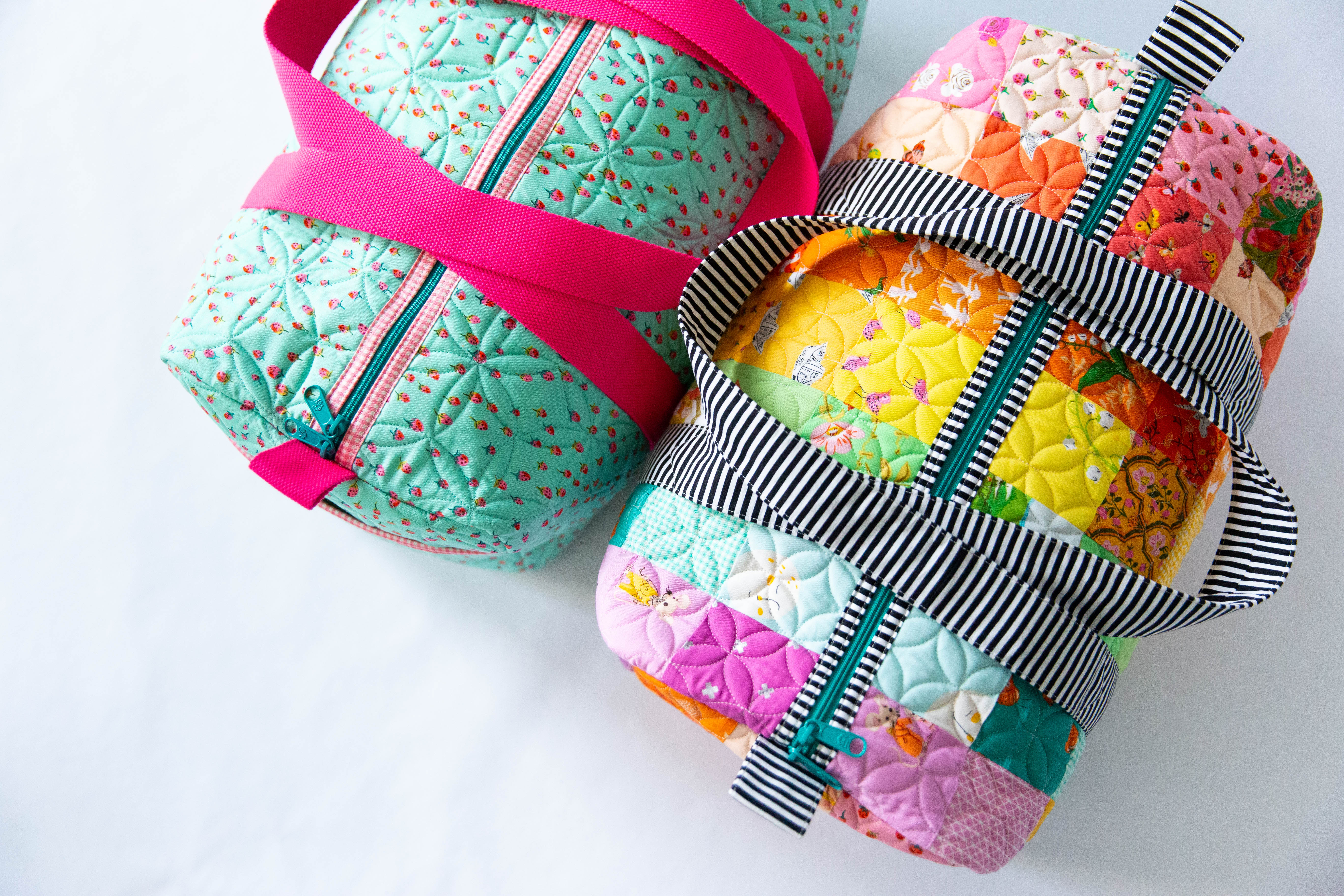 If you enjoyed the Patchwork Duffle, you'll love the mini version! This duffle features a patchwork exterior (or make it with your favorite fabric in a one-fabric version) and a large opening. It's a great companion duffle for your large bag, and also the perfect size for packing for your favorite littles.